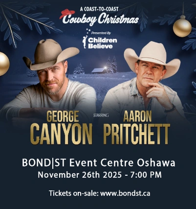 For all country music fans, we’re happy to announce that two talented musicians, George Canyon & Aaron Pritchett, are coming to Oshawa with their “A Coast To Coast Cowboy Christmas” program. The event will take place on Wednesday, November 26, 2025, at BOND ST Event Centre, starting at 7:00 PM.